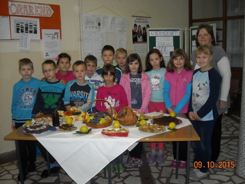 Eljött a PÉNTEK, a Gyermekhét utolsó napja. Ezen a napon sem unatkoztunk az oromi iskolaépületben, már reggel háromnegyed héttől világosság öntötte el az előcsarnokot, a homályos folyosót pedig önfeledt gyerekhangok ébresztették: süteménykiállítás kezdődött! Minden osztály elsőtől nyolcadikig asztalt terített, őszi terméseket hordott össze, melyet ízlésesen elrendeztek.  A főhelyen tálcákon, tényérokon különféle sütemények sorakoztak, amelyeket – miután mindenki kigyönyörködte magát bennük – meg is lehetett kóstolni. Minden elfogyott az utolsó morzsáig!