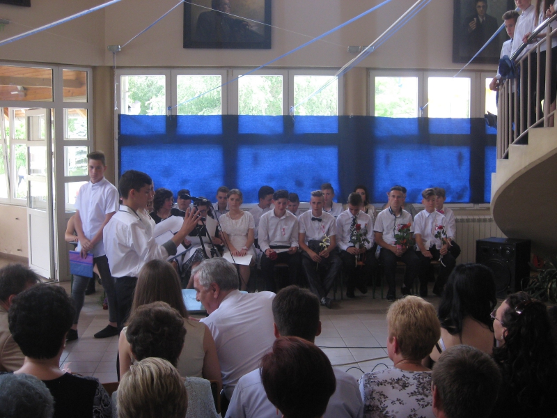 Az osztályfőnöki óra 13 órakor kezdődött, majd hagyományosan minden osztálytól elbúcsúztak a hetedikesek kíséretében. A műsort a hetedik osztályosok nyitották meg, köszöntve a vendégeket és az ünnepelteket. Ezután a nyolcadikosok visszaemlékezése következett az elmúlt szép iskolaévekre. Igazgatónk, Vajda Attila kiosztotta a dicséreteket és jutalmakat, az osztályelső Muhi Hermina lett.