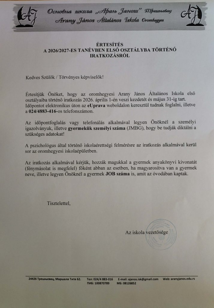 Értesítés a 2026/2027-es tanév első osztályába történő beiratkozásról: